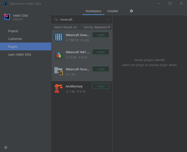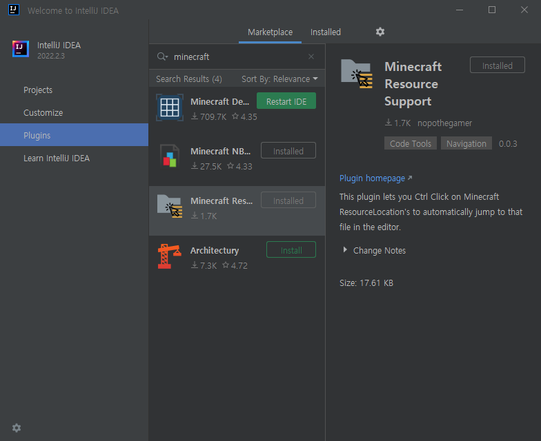 왜냐하면 Minecraft Development 를 설치하면 IntelliJ 를 다시 시작해야 하기 때문입니다.
