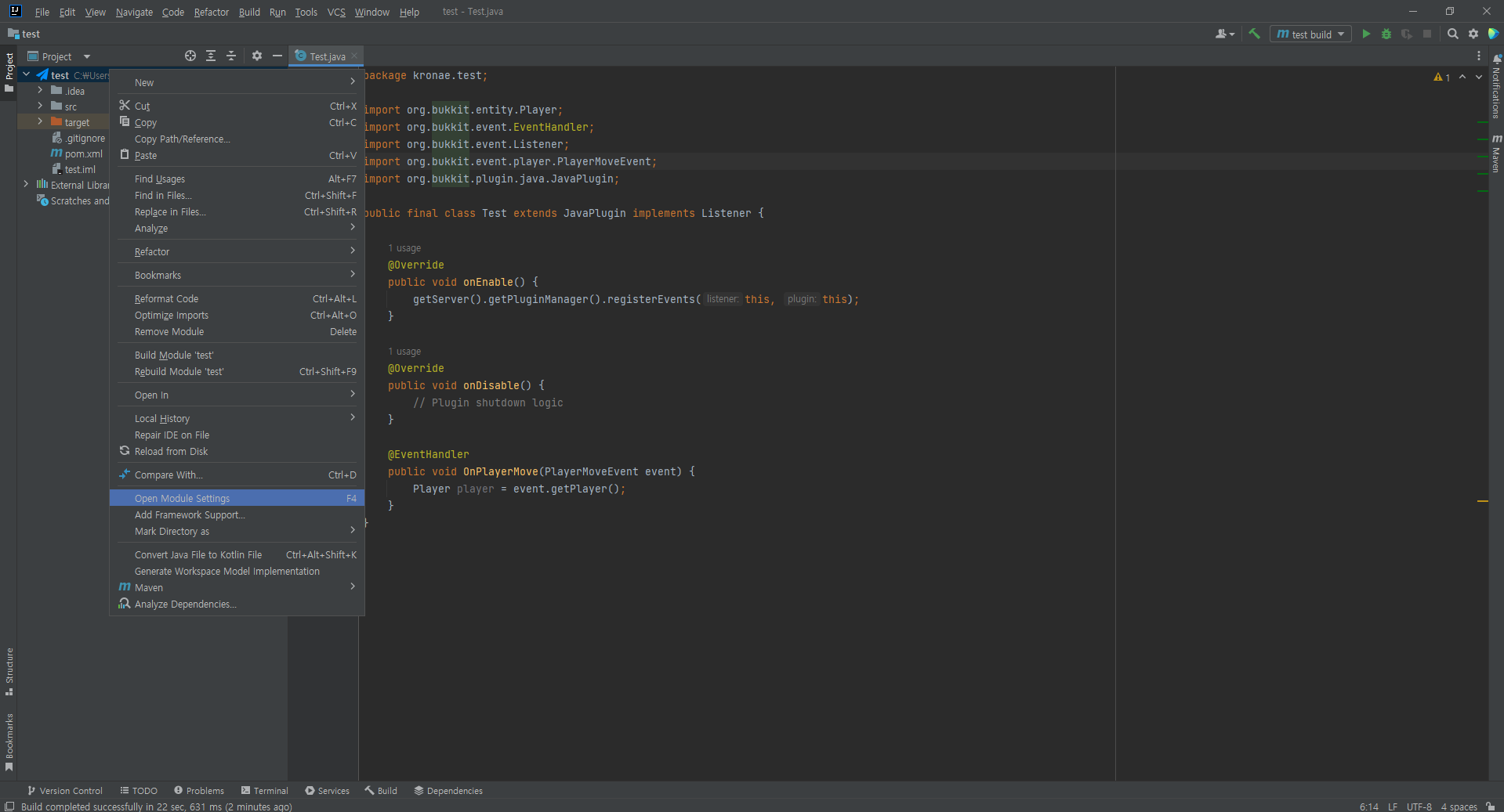 public final class Test extends JavaPlugin { // class 다음에 적힌 Test 는 사람마다 다름