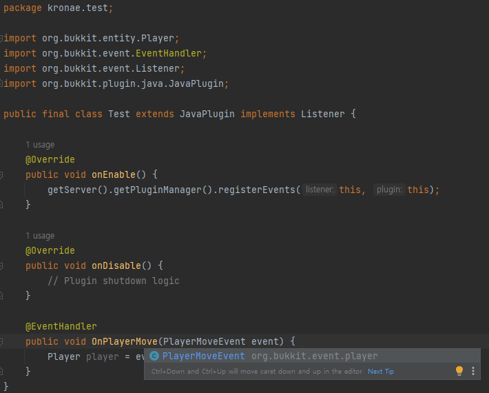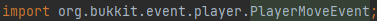 자동완성기능을 이용하면 자동으로 윗쪽에 PlayerMoveEvent 가 import 된것을 확인할 수 있습니다.