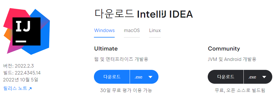 위의 웹사이트에 들어가서 IntelliJ 를 다운로드 합니다.