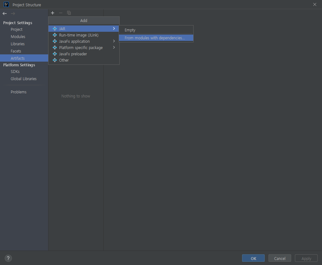 그리고 Artifacts 에서 + 를 누르고 JAR, From modules with dependencies... 을 순서대로 누릅니다.