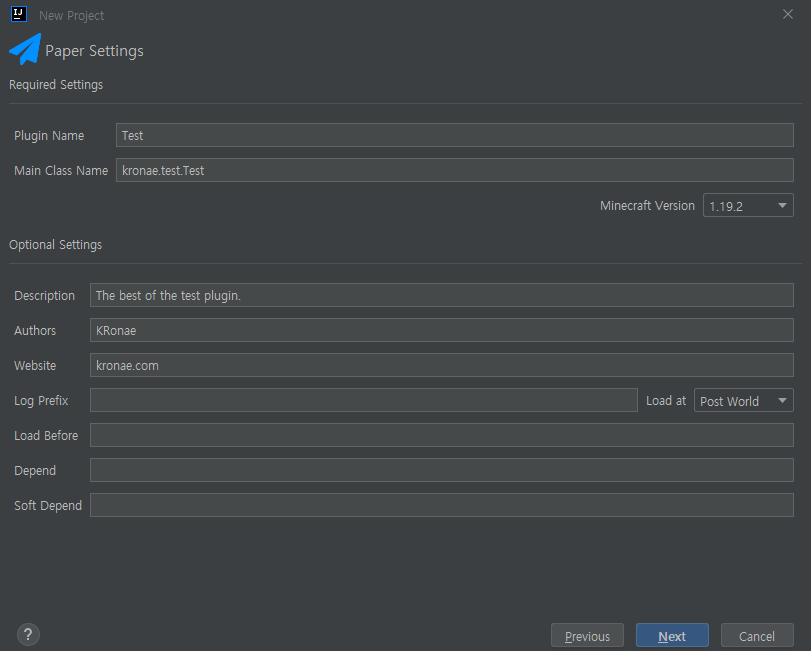 플러그인 이름, 메인 클래스 이름, 설명, 제작자, 웹사이트, 접두사 등을 설정합니다.