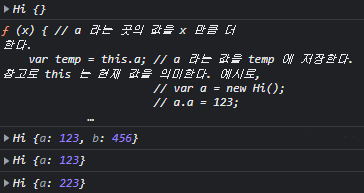 그리고 b 를 new Hi({"a": 123, "b": 456}) 으로 설정합니다.